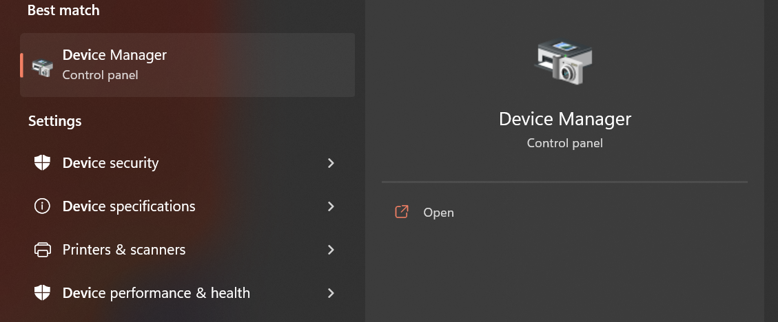 • Open Device Manager by pressing the Windows logo key on the keyboard and typing "Device Manager" to bring up the App.