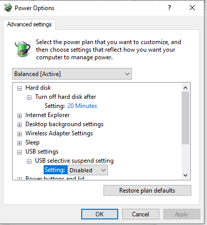 Step 5: Under USB Settings select Disabled for "USB Selective suspend settings"