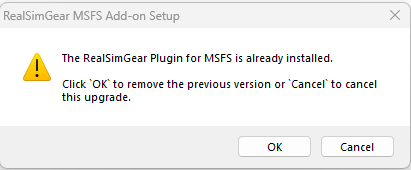 As part of the install process, if you have previously installed the RealSimGear Plugin for Microsoft Flight Simulator, you will be prompted remove previous versions. Click "OK" to proceed.