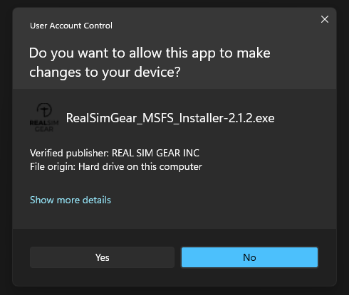 Once downloaded, find (usually your Downloads folder), the installer, "RealSimGear_MSFS_Installer-2.1.2.exe" and double click it to run the installer.
