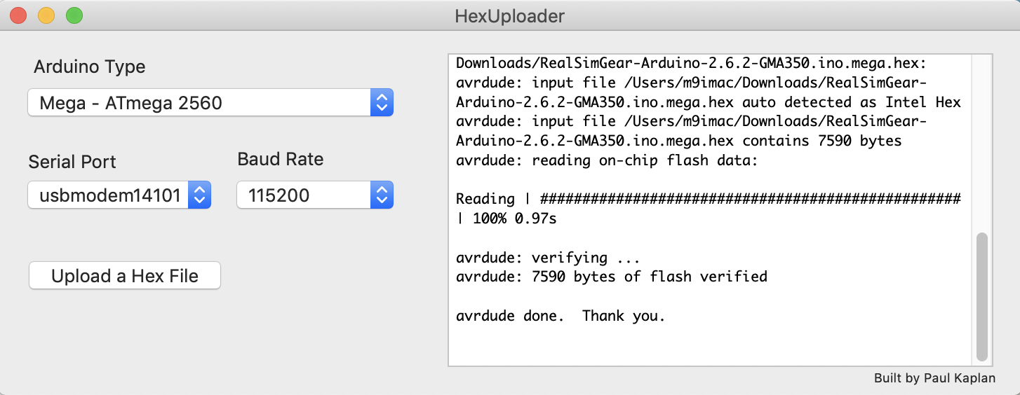 Once configured, simply hit the "Upload a Hex File" button, which will prompt you to select the .hex file downloaded above. As soon as you choose that file, the upload will begin. The upload will only take a few seconds and, when finished, will read, "avrdude done. Thank you".