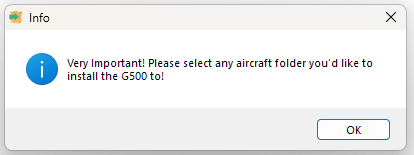 Follow the prompts to the target aircraft folder. The target aircraft is the aircraft you wish to use the G500 avionics with.