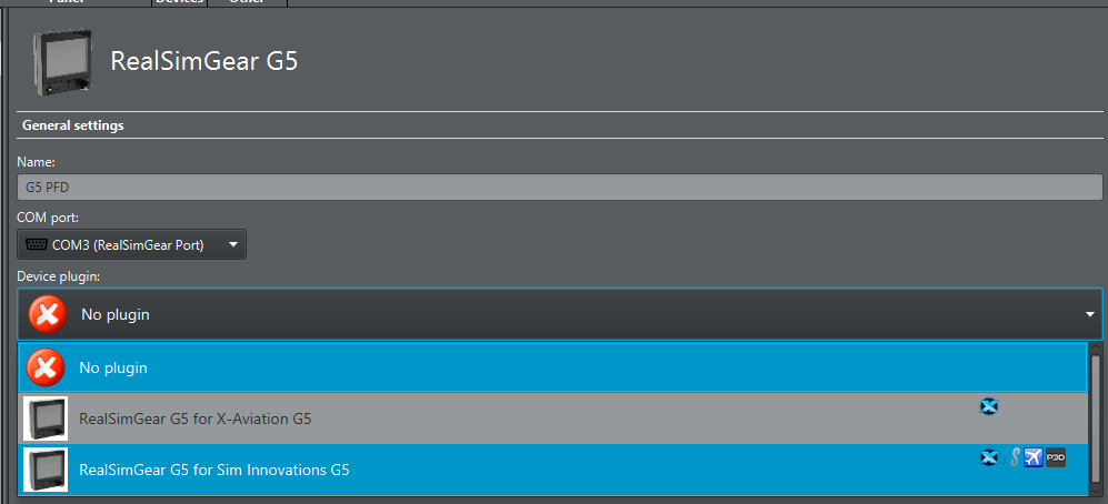 Once you have named the device, select the plugin. For the Air Manager Premium G5 Panel, select "RealSimGear G5 for Sim Innovations G5"