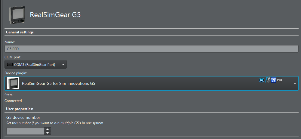 Below the Device Plugin Selection will be a User properties dialog to set the G5 Device Number. By default all G5's will be numbered "1". You will only need to renumber the G5 device if you are adding a second G5 for the HSI.