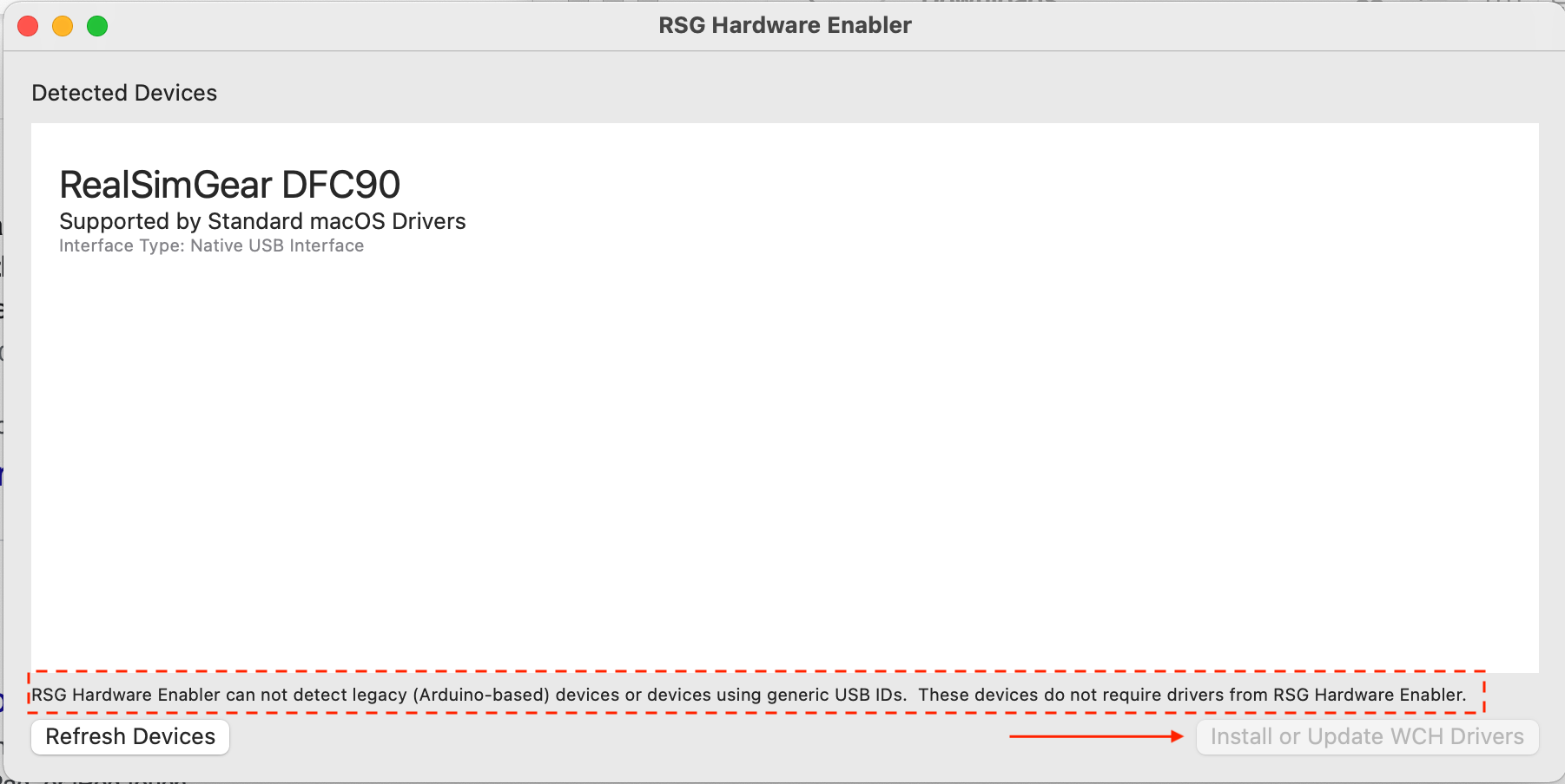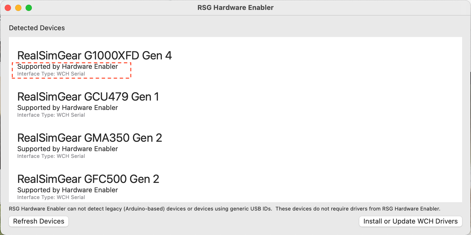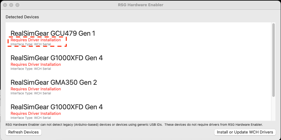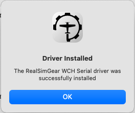 If you are using RealSimGear hardware that is based on the WCH USB chip (the one that gave us problems in the past for Big Sur), you will see the screen below indicating "Requires Driver Installation". If so, proceed with the install steps below.
