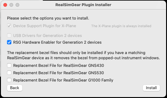 7. In the Install options, leave the "RSG Hardware Enable for Generation 2 devices" checked and if you have one of the products shown, G1000, GNS430 or GNS530, choose those options. If you have any other products, you can leave those unchecked (this is just to determine whether to copy the bezel files for these products or not). Click "Install".