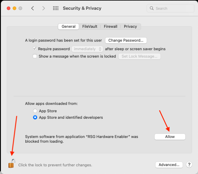 3. This will open up your MacOS Security Preferences. First click on the lock icon in the lower left corner and provide your password to unlock this screen. This will cause the "Allow" button to become clickable, click "Allow".
