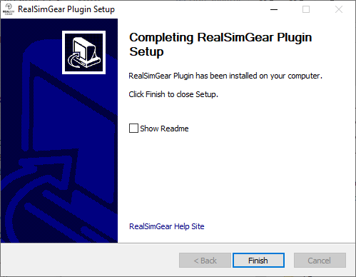 Once the drivers install, setup is complete, you can choose to show the README for more information about the plugin, or visit the RealSimGear help site by clicking on the link ...